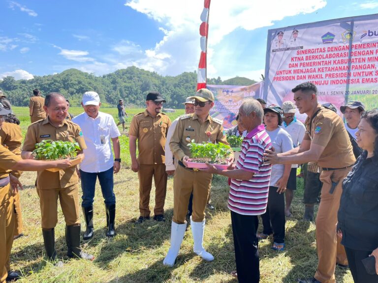 Bupati Minahasa Utara Joune Ganda didampingi Dinas Pertanian melakukan penanaman bibit padi di Desa Kema 1 Kecamatan Kema, Senin (20/1/2025).