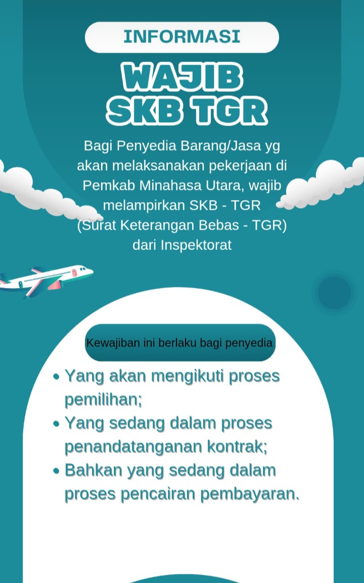 Pemkab Minut mengimbau bagi penyedia barang/jasa yang belum memiliki SKB-TGR segera mengurusnya di Inspektorat Kabupaten Minahasa Utara. Informasi lebih lengkap mengenai persyaratan dan prosedur pengurusan dapat diperoleh langsung di kantor Inspektorat.